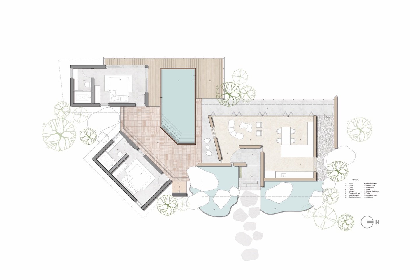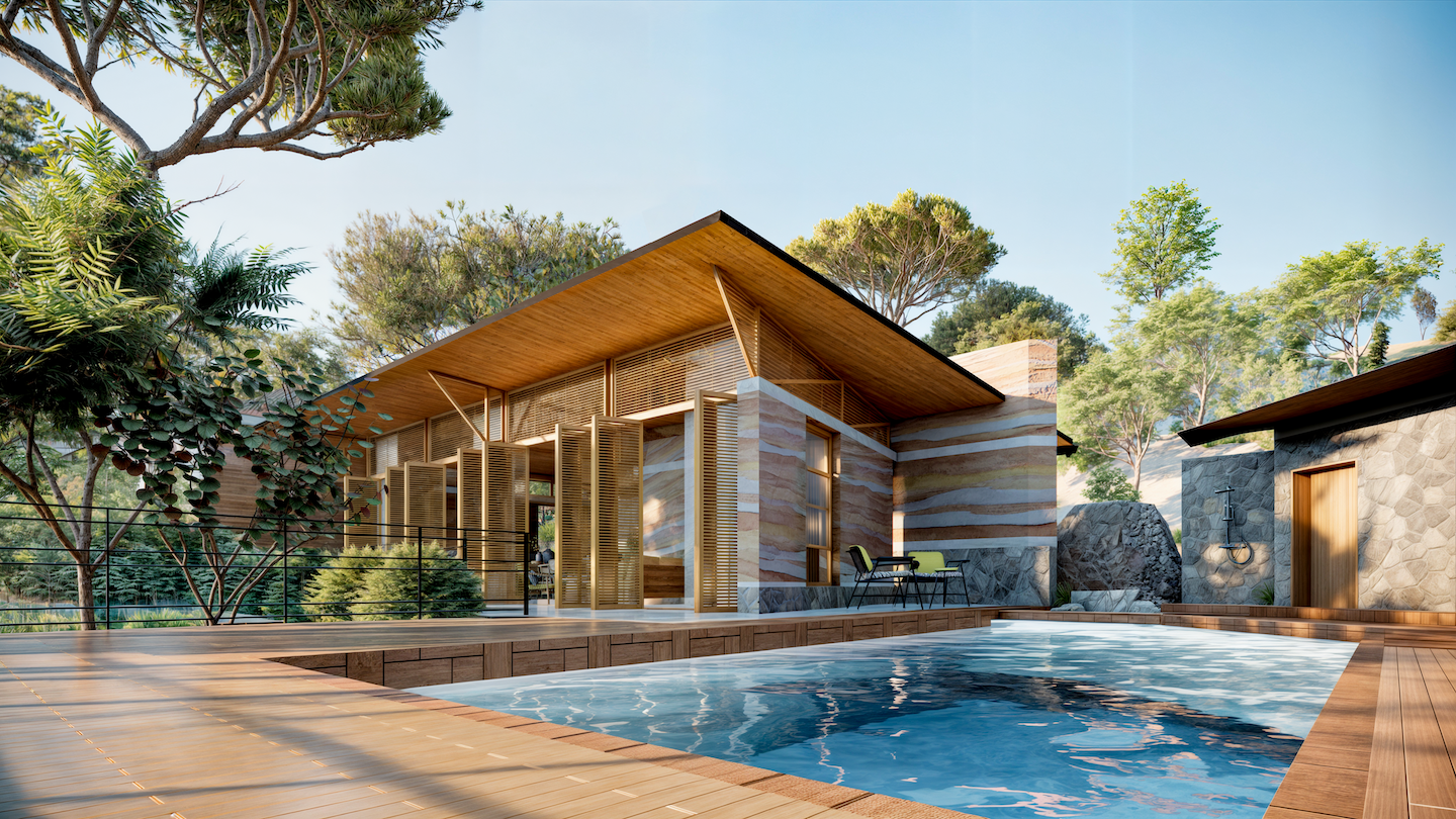 Two smaller structures, housing private bedrooms, encircle a central courtyard with a pool. Together, these three forms create a harmonious layout, fostering both privacy and a sense of connection to the landscape. The structures are unified under sweeping, organic roofs that enhance the design’s aesthetic appeal while serving a functional purpose, harvesting rainwater to sustain the Koi ponds.