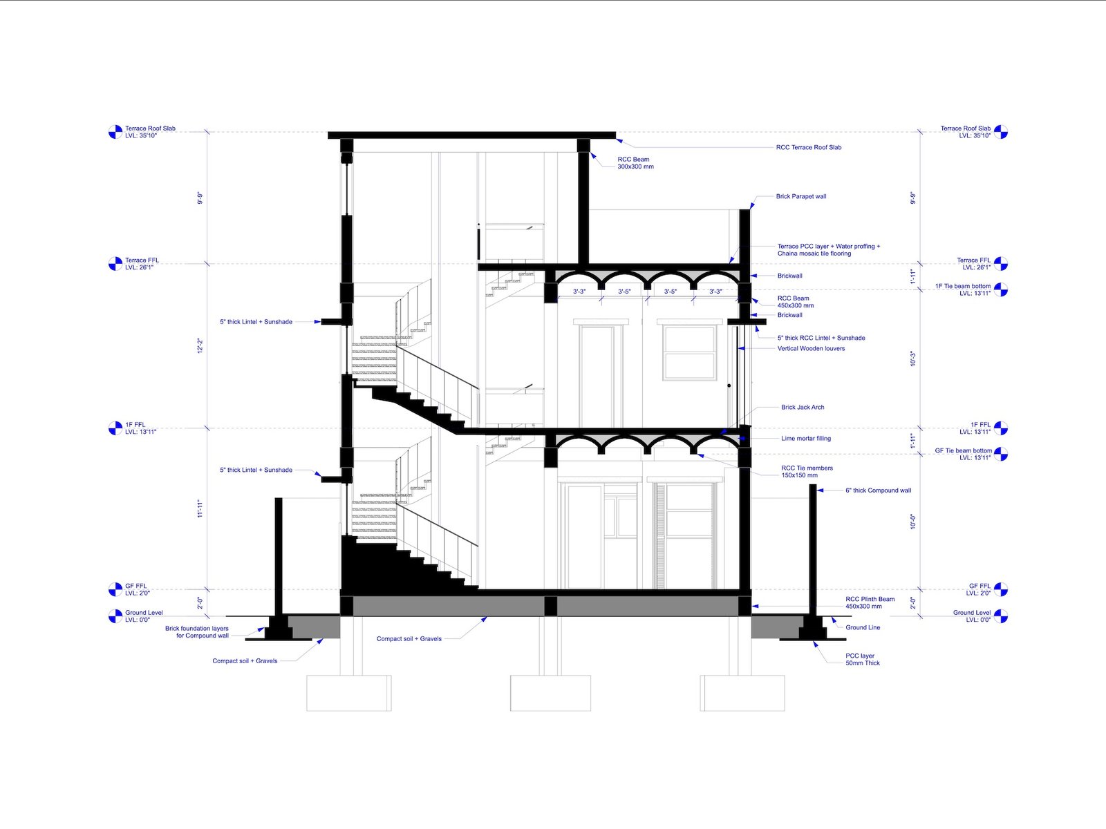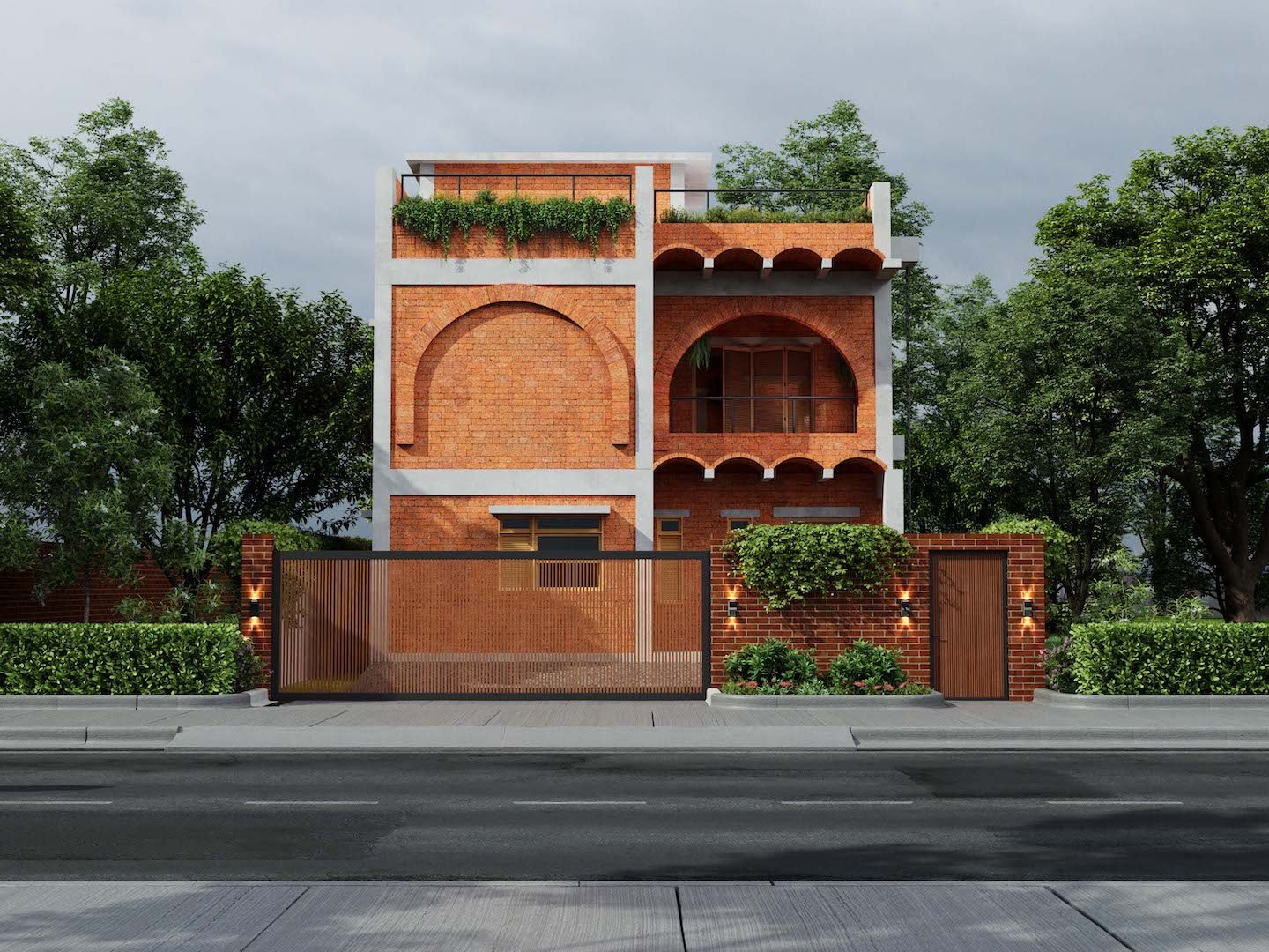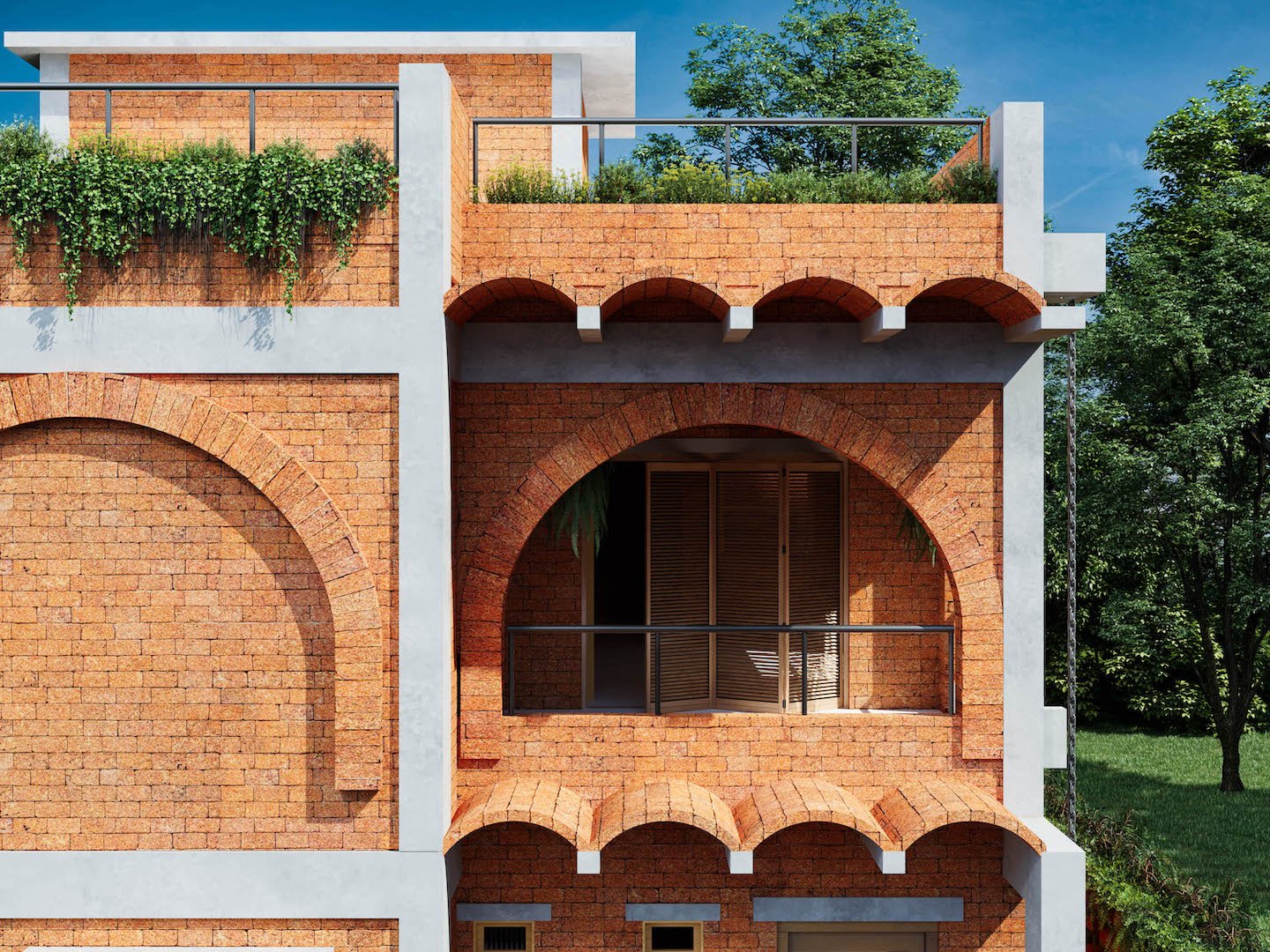 The design reduces material usage with a jack arch slab system, which requires less concrete than conventional slabs without compromising structural integrity. An internal courtyard, complemented by a stone jaali screen, introduces a natural cooling mechanism; channeling breezes and filtering the air before it flows through the house. This careful orchestration of airflow adds a layer of passive cooling, reducing energy demands.