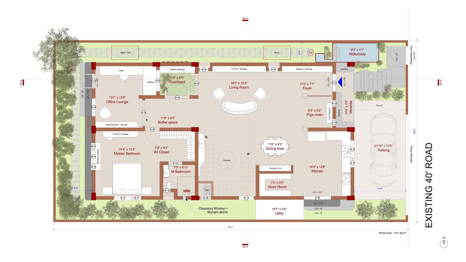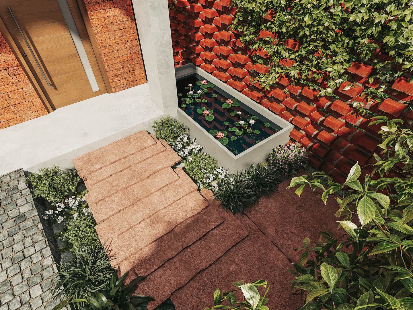 Water is treated as a precious resource in this home. Rainwater from the terrace cascades down decorative water chains into a small entrance pond, creating a serene water feature. The excess water is then directed to a rainwater harvesting pit, promoting self-sufficiency and water conservation. Meanwhile, the terrace is envisioned as a thriving garden, adding greenery to the home and contributing to thermal comfort.