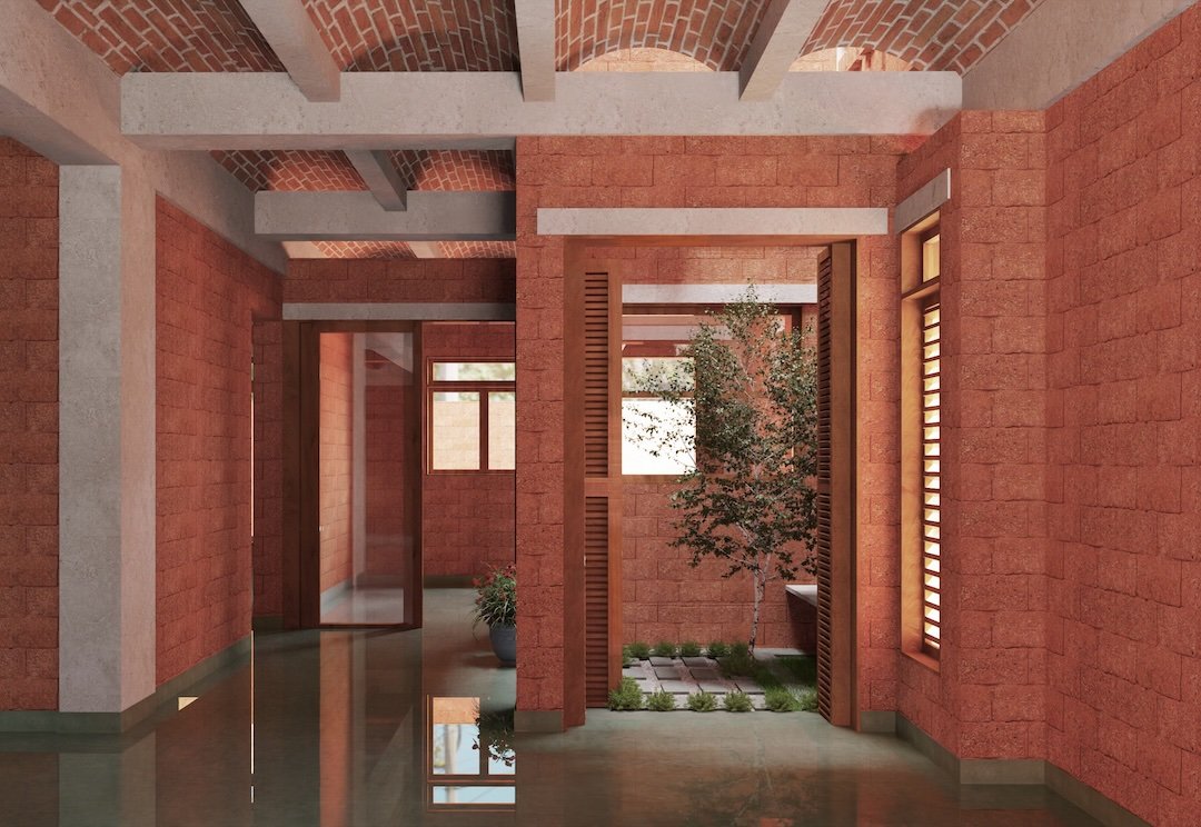 To stay rooted in local context, the home is constructed using laterite stone for the walls; a material known for its excellent thermal insulation properties. This choice not only reduces the carbon footprint but also helps maintain comfortable indoor temperatures, minimising the need for artificial cooling. The interior walls will be finished with lime plaster, a natural, breathable material that’s been used in Indian homes for centuries, while the exterior walls proudly showcase the rugged beauty of exposed laterite stone.
