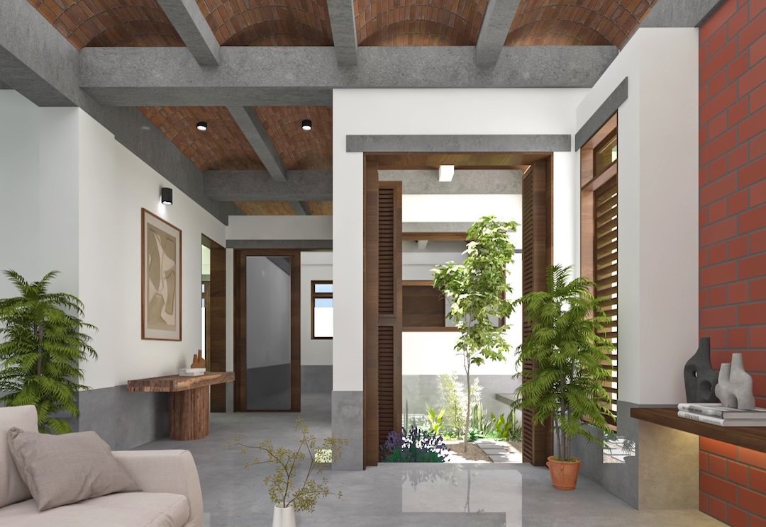 The design reduces material usage with a jack arch slab system, which requires less concrete than conventional slabs without compromising structural integrity. An internal courtyard, complemented by a stone jaali screen, introduces a natural cooling mechanism; channeling breezes and filtering the air before it flows through the house. This careful orchestration of airflow adds a layer of passive cooling, reducing energy demands.